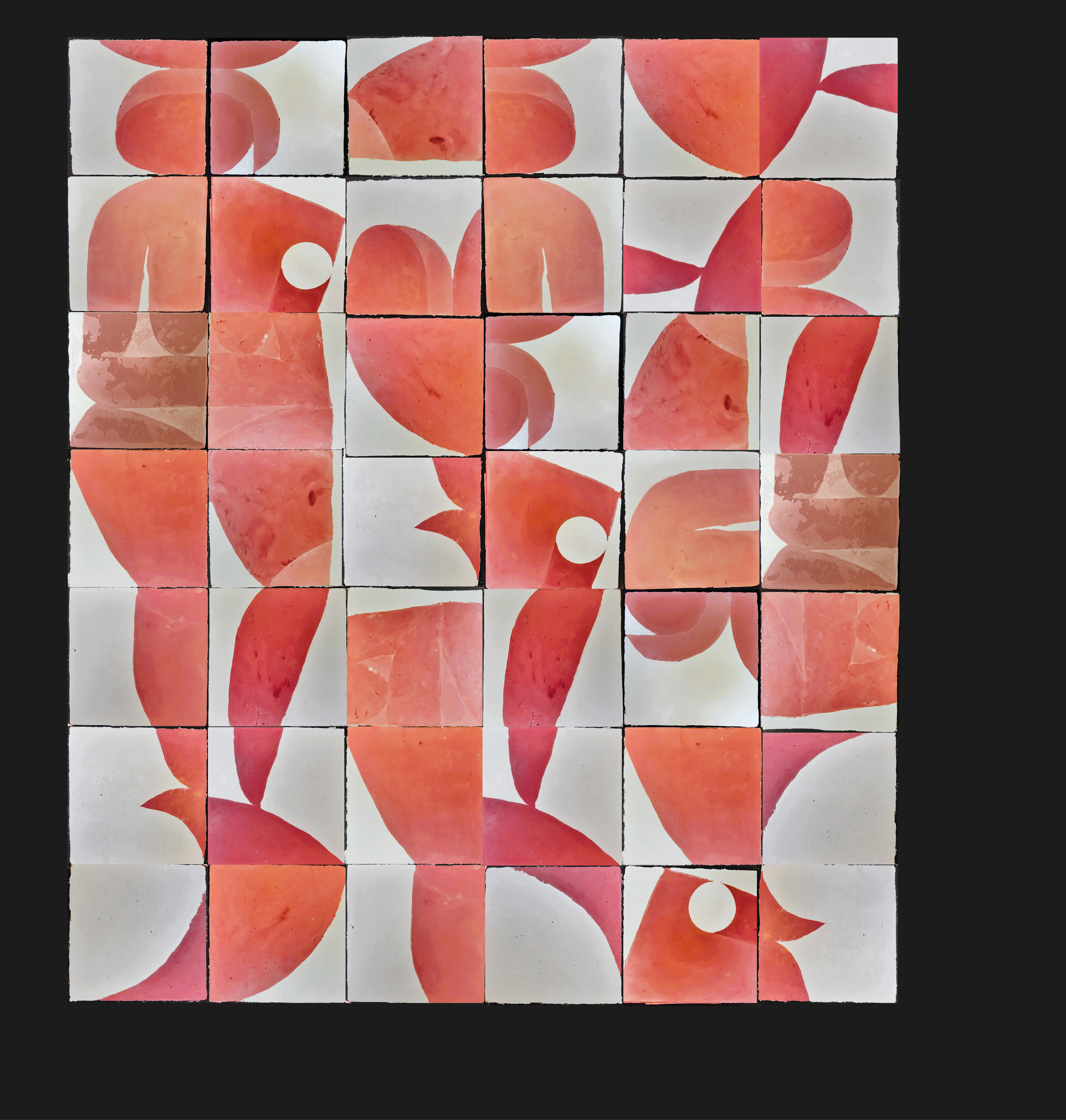 The hand-made cement tiles, when arranged randomly, suggest a pattern – though they were initially conceived as a form of self-portraiture. The figure encoded within them serves as both a pretext and a space for haptic experience. The eye perceives shape through touch, engaging with its materiality rather than merely scanning its surface. Its code is embedded in our personal software. To decipher it privately, we need, above all, intuition.