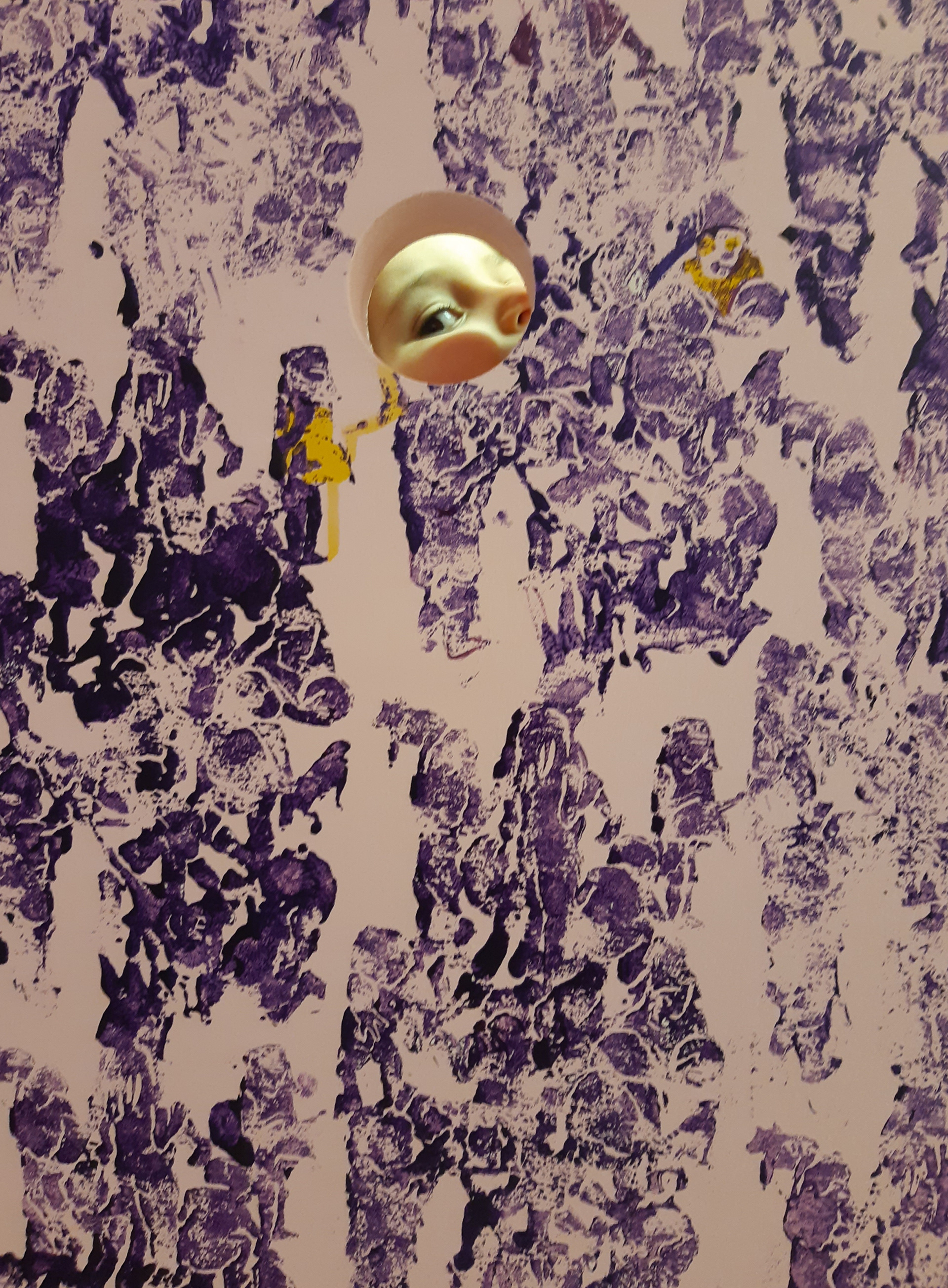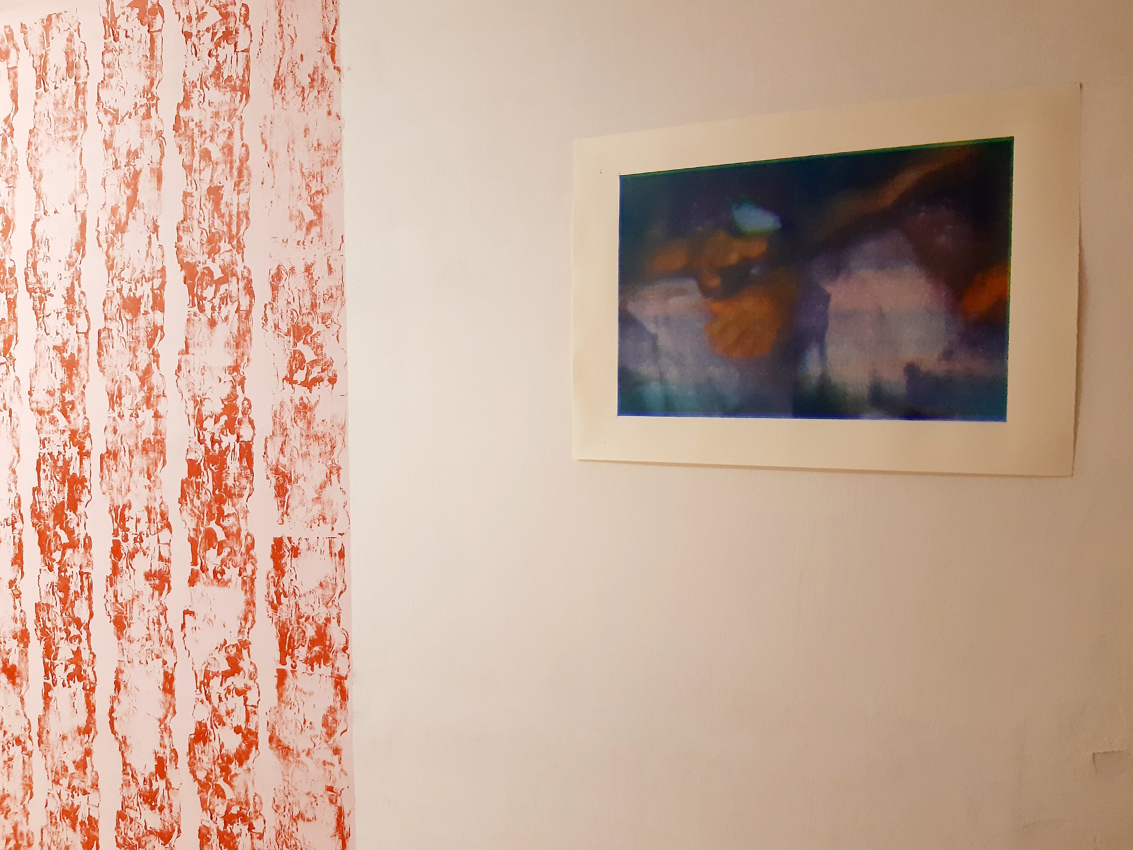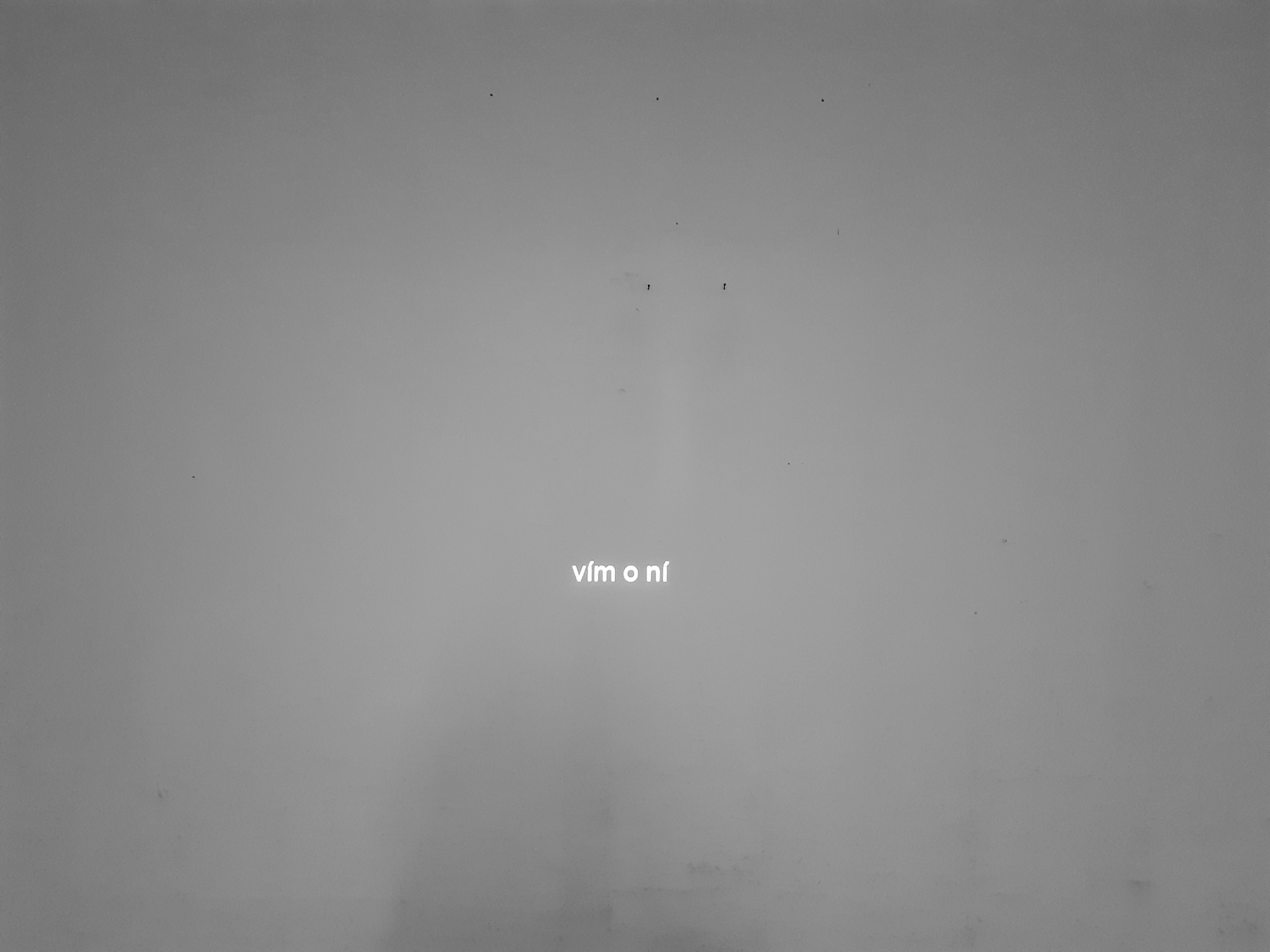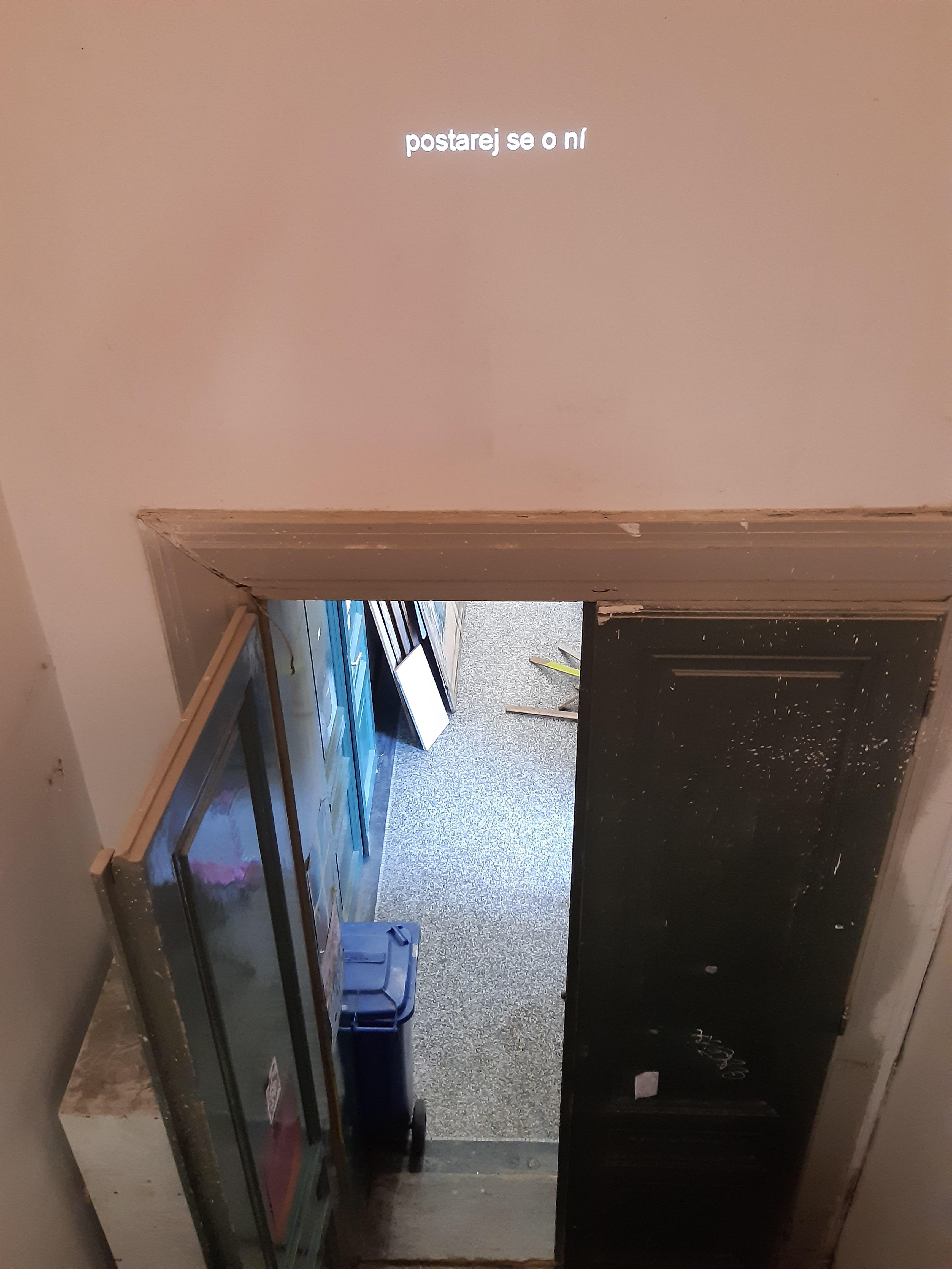 The subject of the matrix (imprint) was the key to the visual transformation of the space – I created four original linocut patterns which were transferred directly to the walls. The repetitive patterns helped inhabit the space which became a room. The optic division of the space referred to the distance between two close people who share the room. They have access to each other but they keep communicating through a particular membrane of their own limits. The room was facing a short video confronting us with the fatality of both the deliberate and unintentional interventions we make as parents. Its text-based passage offered the viewer a fragmented insight in such family environment where the ones we collide with is mostly ourselves.