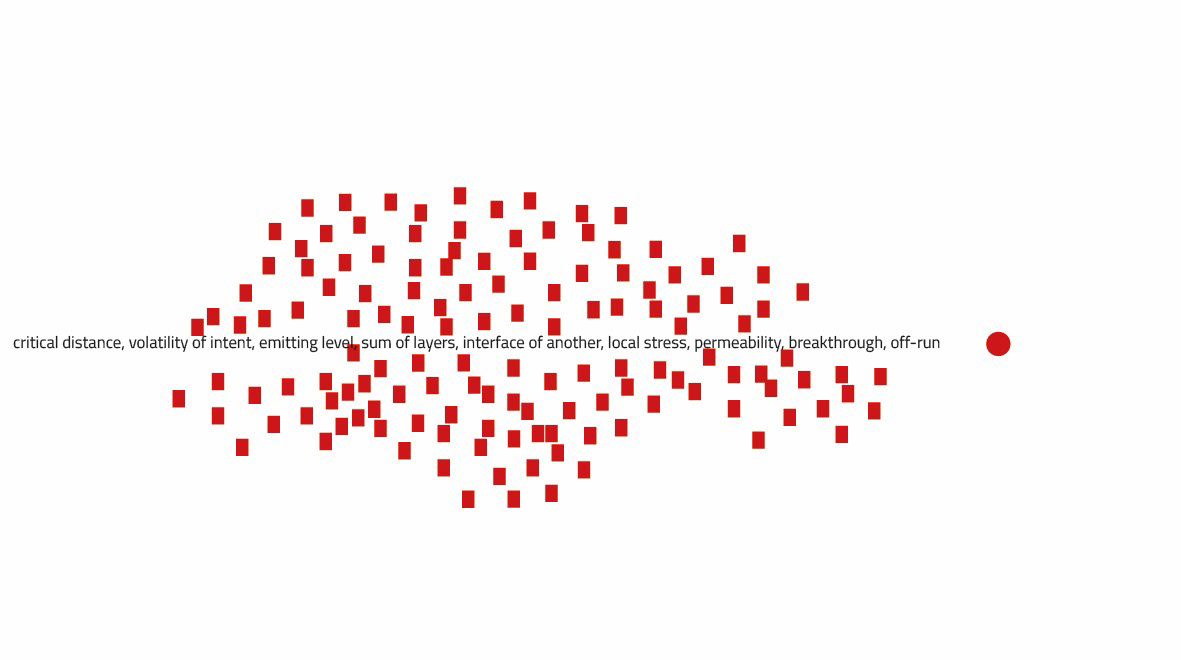 The task before us is meant to be lapidary in its essence—brief but to the point; apt and concise. Let's focus on its content and execution, on the functionality of message transmission. The main transfer variables have a physical basis. They are the critical distance, volatility of the intent, emitting level, sum of the layers, interface of another, local stress, permeability, breakthrough, off-run. Our assignment is to test our presence of mind, haptic memory, and to find new, functional connections with others.