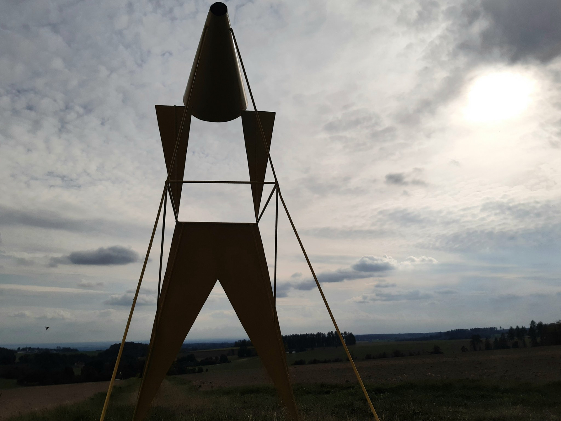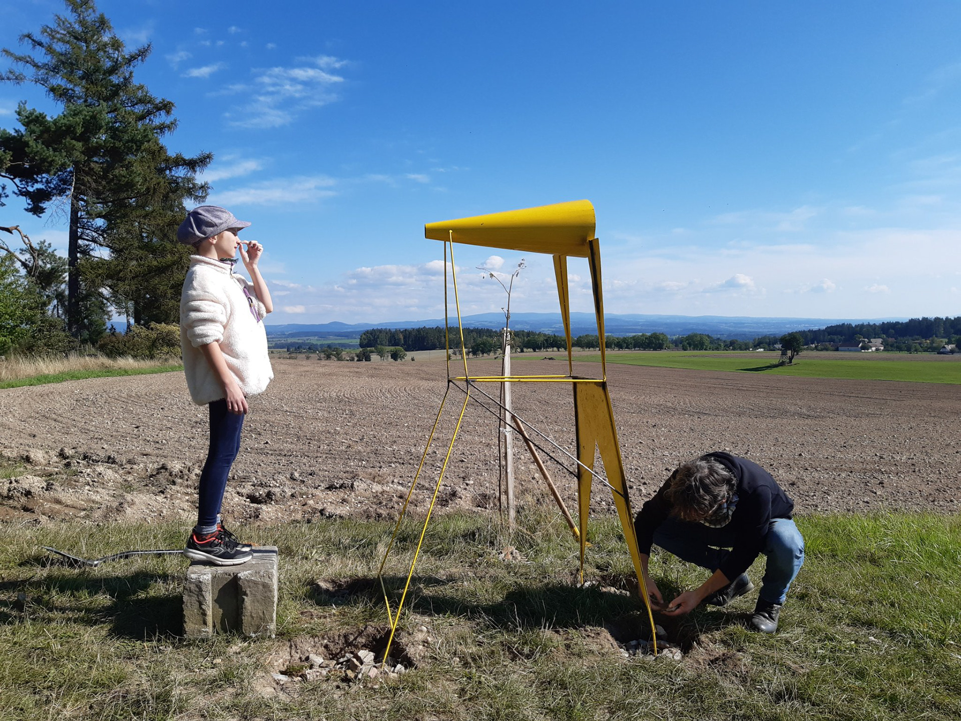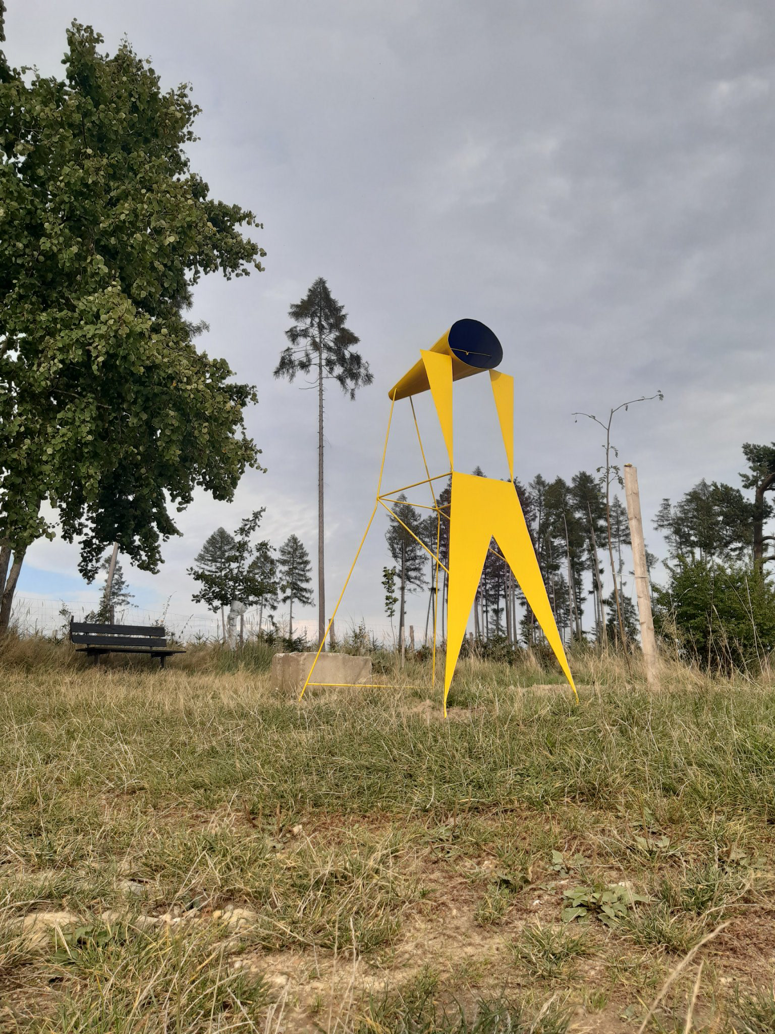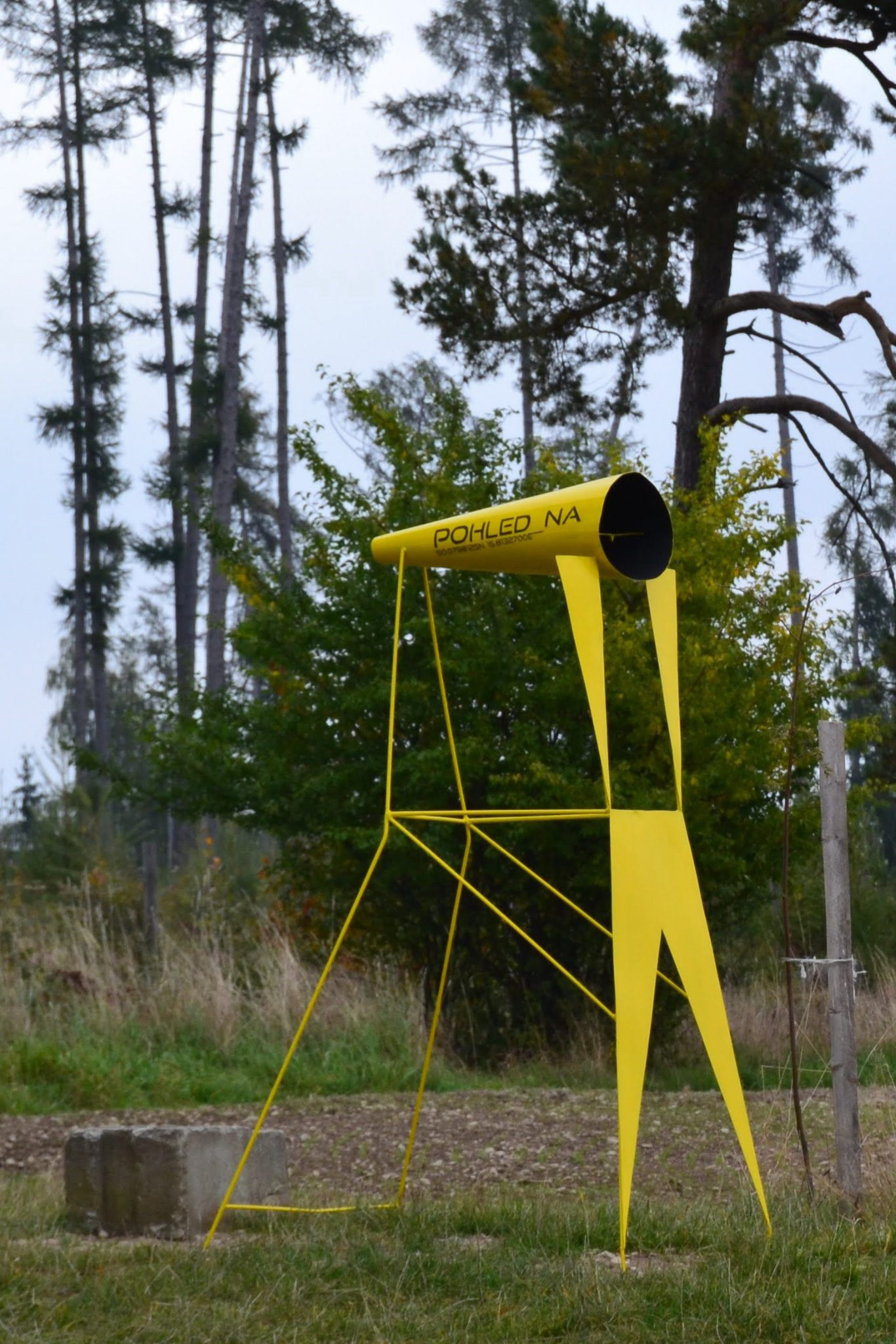 Today I dare to see a gnome differently. In human scale, firmly straddled, head (mind) open, hat-funnel placed between shoulders and absorbing the horizon. The original massive concrete plan was transformed and reduced to a subtle metal structure, which is closer to a lookout tower, a rocket or perhaps a leveling bar. In the funnel, a heartbeat is indicated, which directs us with our gaze to life, to the gaze that takes place now and here, thanks to the one who is currently looking. By looking through the funnel, we also connect two places - Posadov and Pardubice, two places of interrelationship and spontaneous movement. Last but not least, there is a distinctive yellow – the color that most of the tools in the Posadov workshop are painted. The gnome is not standing in the garden, it is standing right here, by the bench, by the forest, in the place where the regenerative activity can be carried out - enjoying the landscape.
