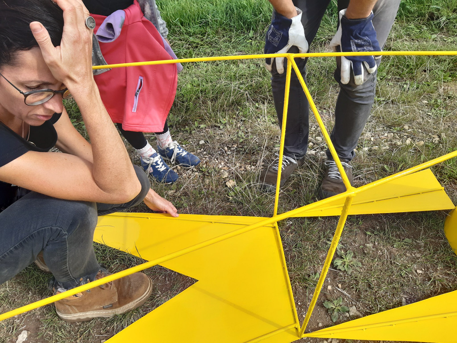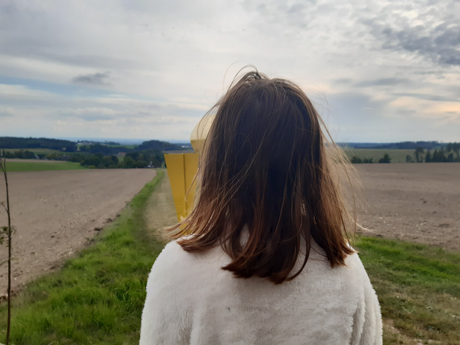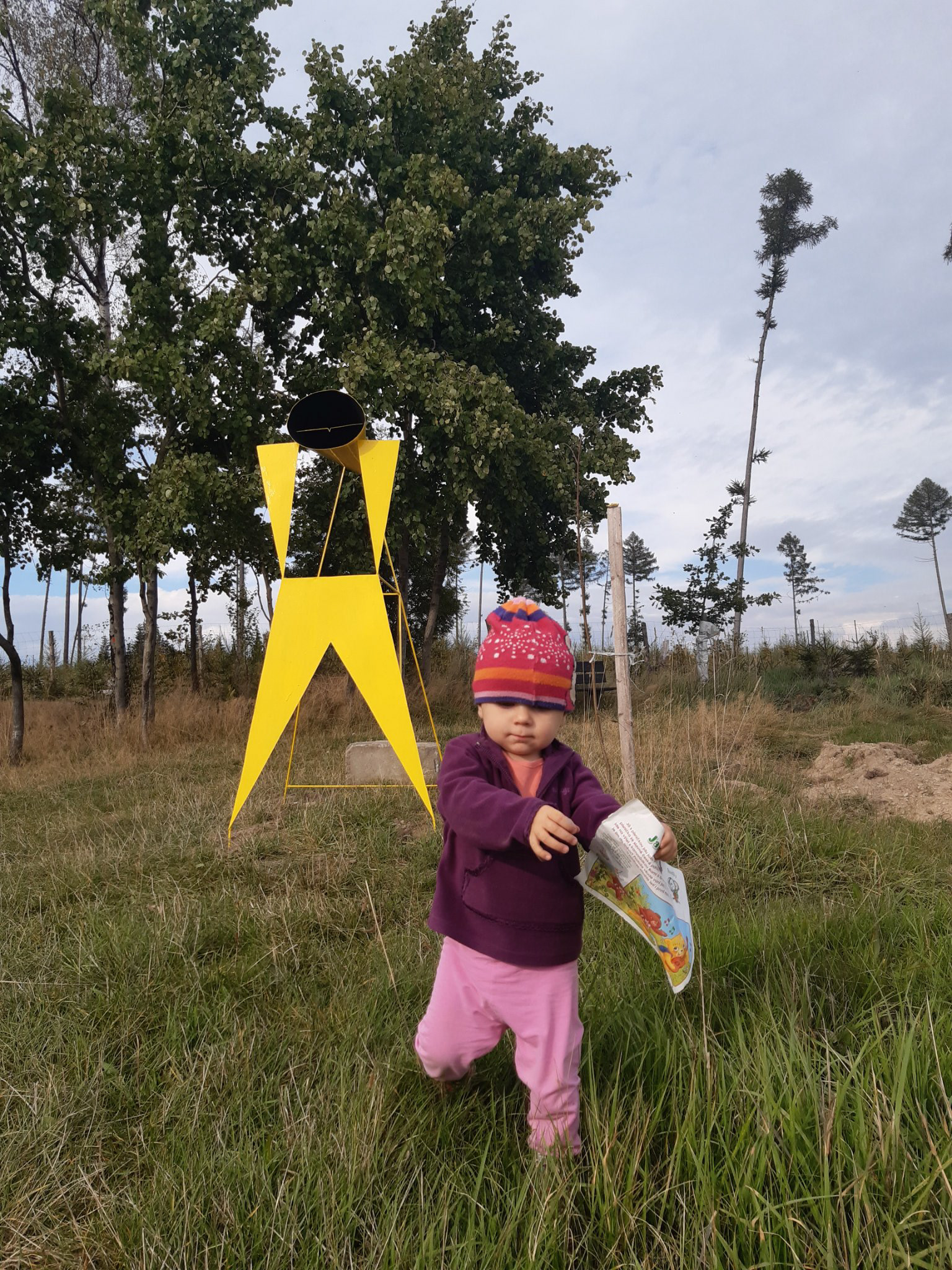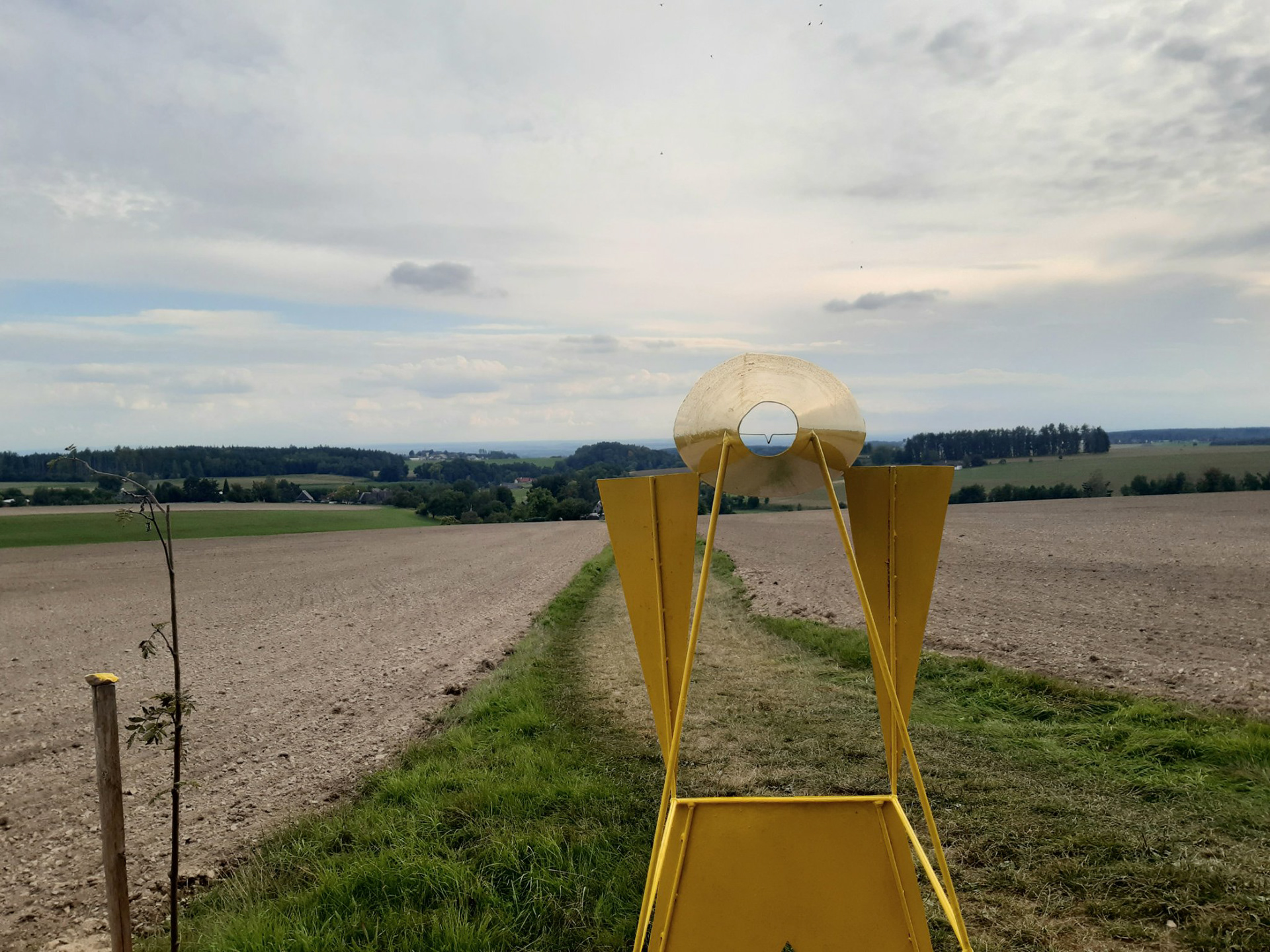 Today I dare to see a gnome differently. In human scale, firmly straddled, head (mind) open, hat-funnel placed between shoulders and absorbing the horizon. The original massive concrete plan was transformed and reduced to a subtle metal structure, which is closer to a lookout tower, a rocket or perhaps a leveling bar. In the funnel, a heartbeat is indicated, which directs us with our gaze to life, to the gaze that takes place now and here, thanks to the one who is currently looking. By looking through the funnel, we also connect two places - Posadov and Pardubice, two places of interrelationship and spontaneous movement. Last but not least, there is a distinctive yellow – the color that most of the tools in the Posadov workshop are painted. The gnome is not standing in the garden, it is standing right here, by the bench, by the forest, in the place where the regenerative activity can be carried out - enjoying the landscape.
