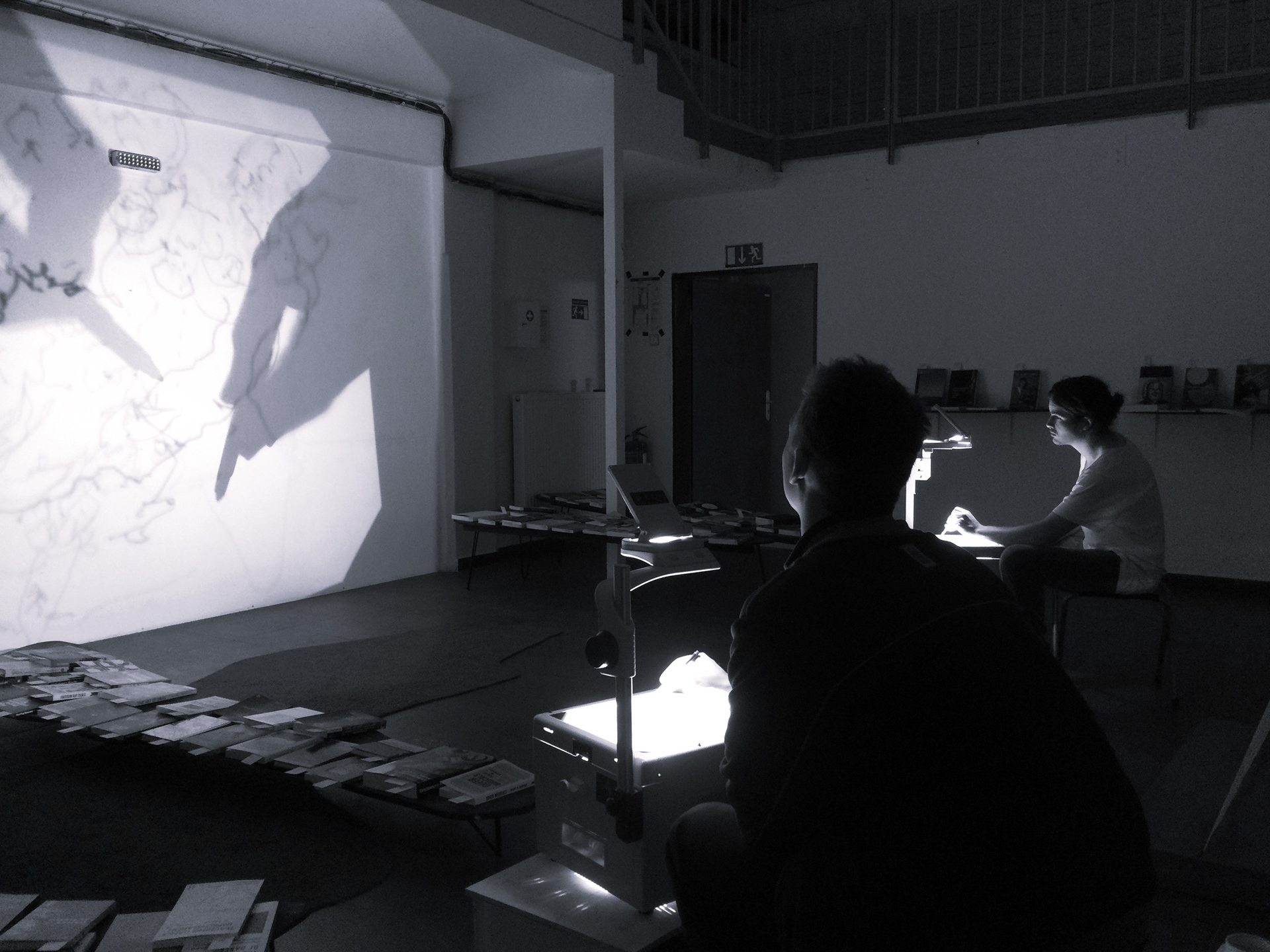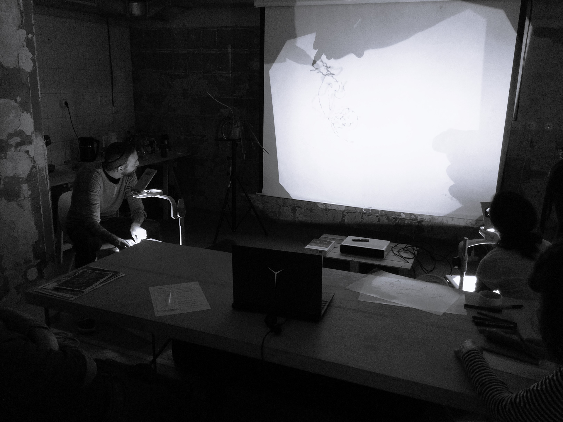 This research drawing workshop explores drawing as a tool for mutual perception, communication, and spatial reading. Two artists, situated in separate locations, work simultaneously—each at their own meotar—yet their images combine into a shared projection. This creates an intermedial space where two gazes, two presences, and two physicalities meet within a single shared visual layer.