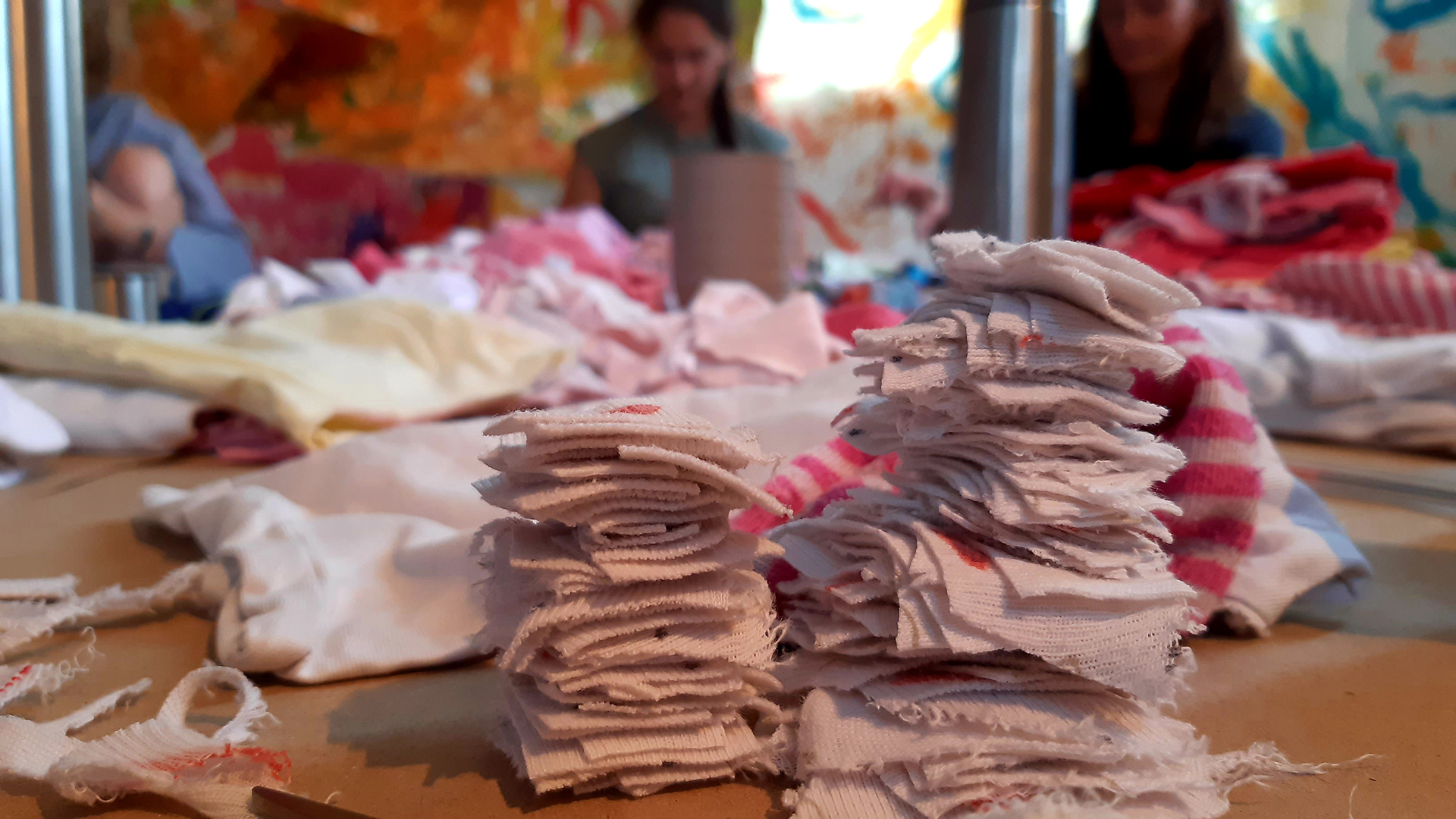 An intimate meeting during which mothers together break down worn children's clothes into small pieces. It is a performative event during which, in the very act of "scrubbing", individual layers of care and remembering the intense period of the first years of motherhood with all the emotional implications and questions regarding personal transformation are revealed. Together we can find out if and how it is possible to retrospectively share an individual experience in a group and reconstruct its potential by repeatedly touching the material.