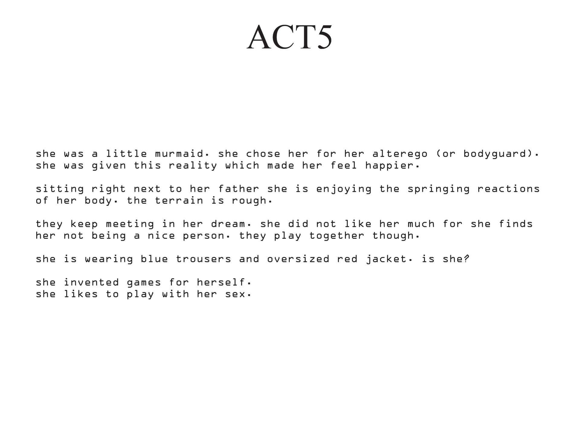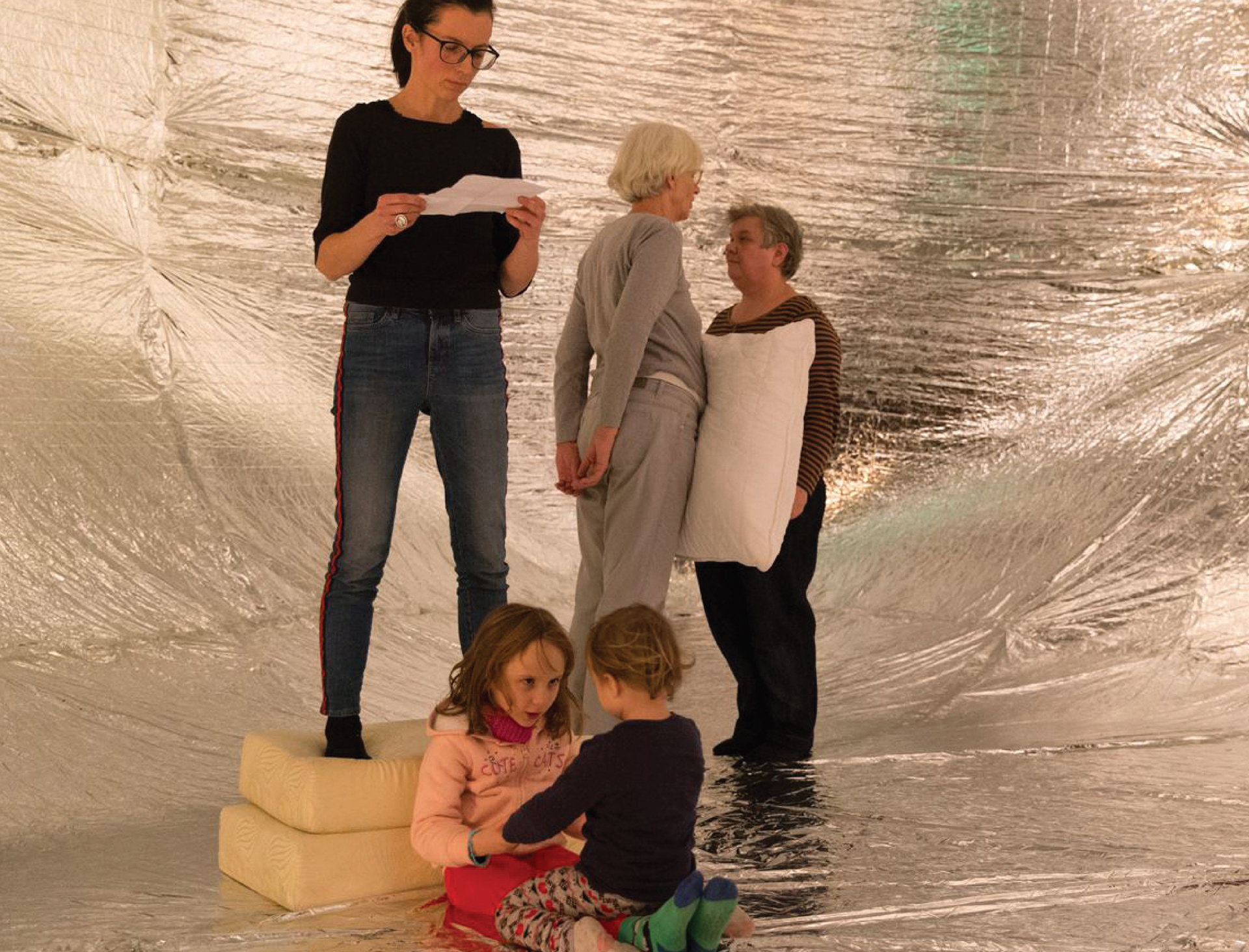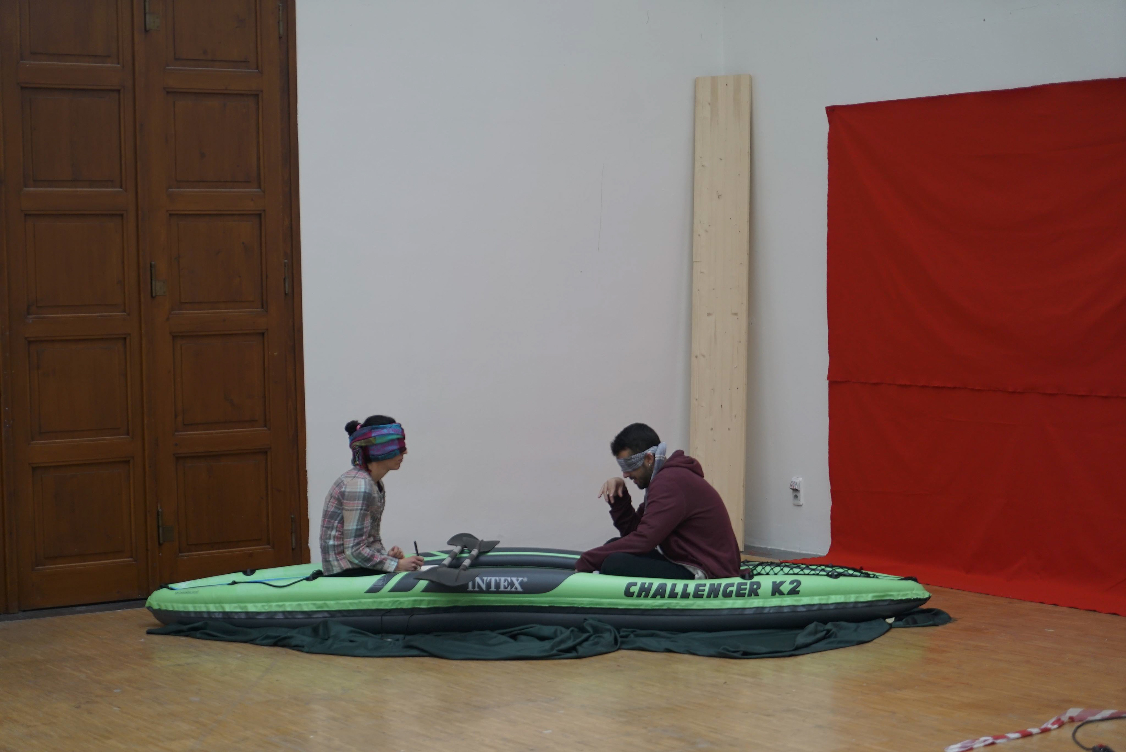 The play of five acts was composed from the monologues of seven people who were invited to share their earliest childhood images. The blindfolded intimate talks in the inflatable kayak placed directly in the studio created a specific save space to open and enter our personal experience. The earliest images connect us to the outside world and at the same time represent the strong and fragile ties to the inner space constituted and saved in our memories.