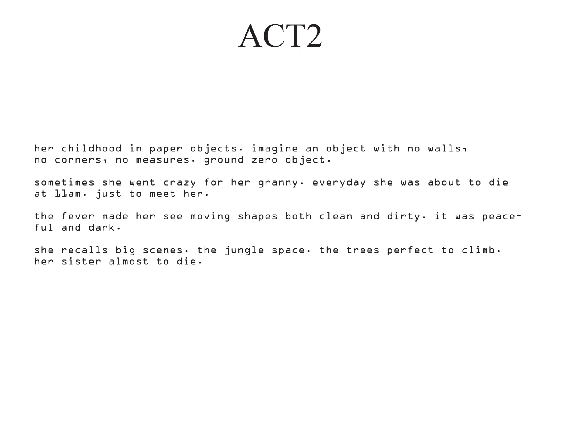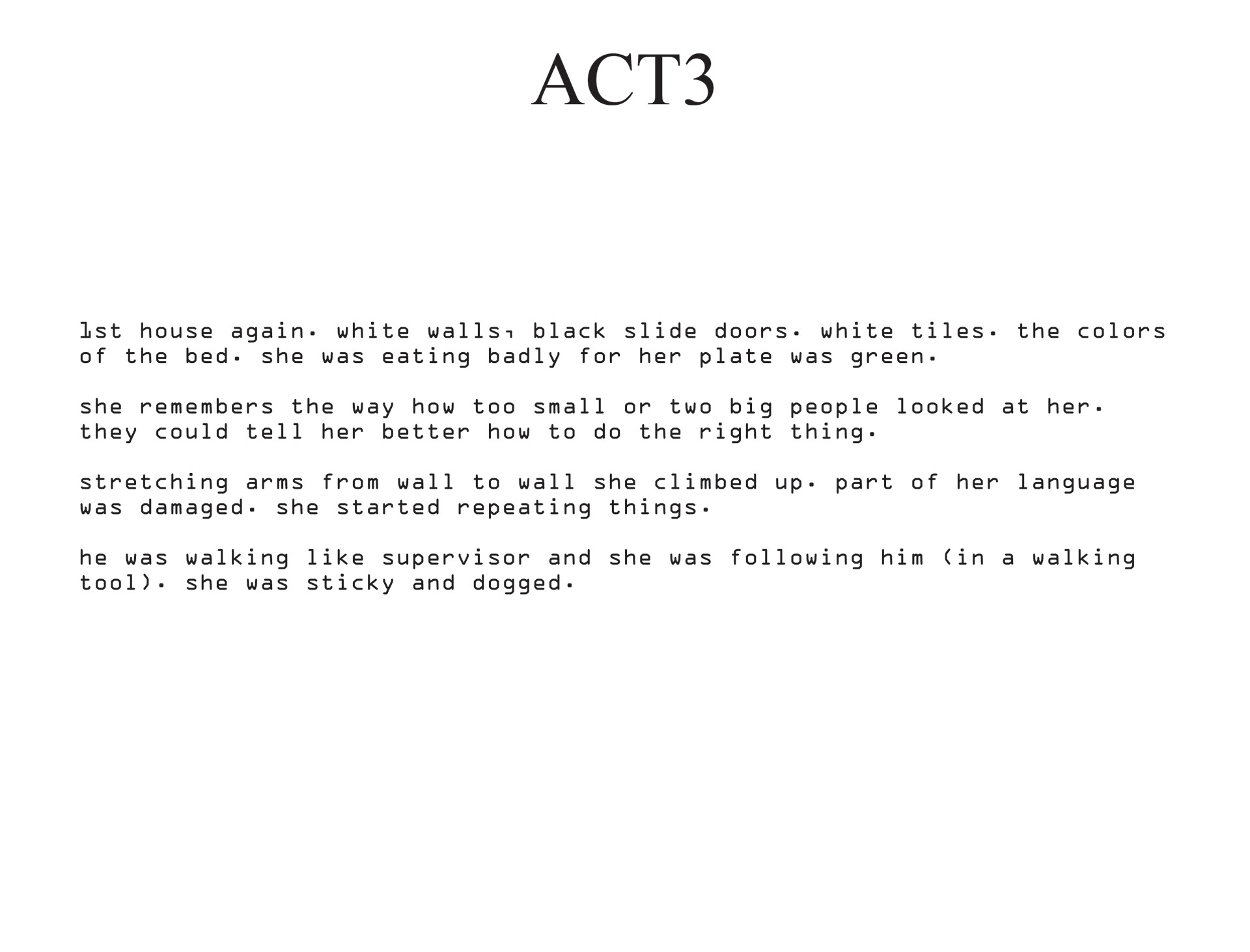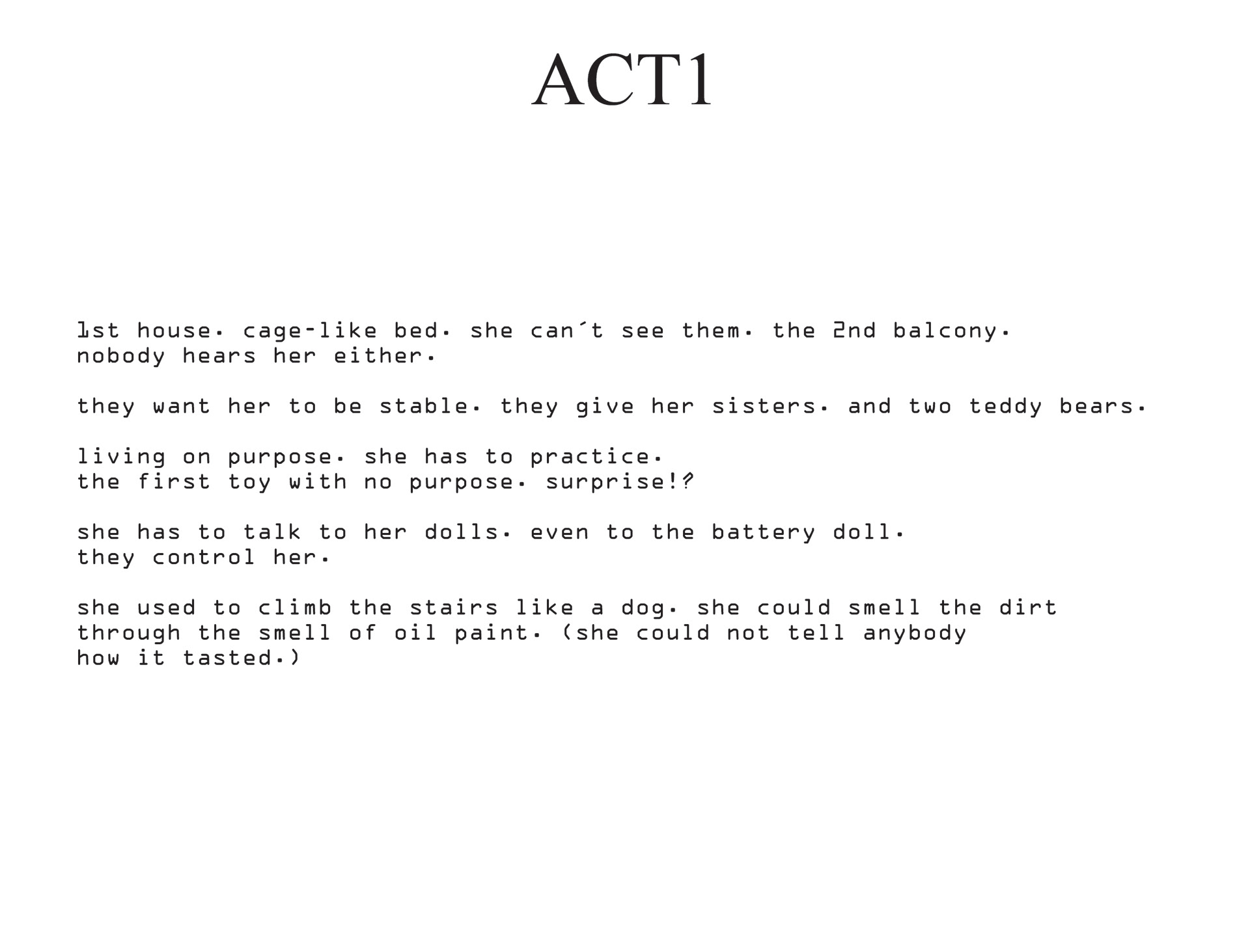 The play of five acts was composed from the monologues of seven people who were invited to share their earliest childhood images. The blindfolded intimate talks in the inflatable kayak placed directly in the studio created a specific save space to open and enter our personal experience. The earliest images connect us to the outside world and at the same time represent the strong and fragile ties to the inner space constituted and saved in our memories.