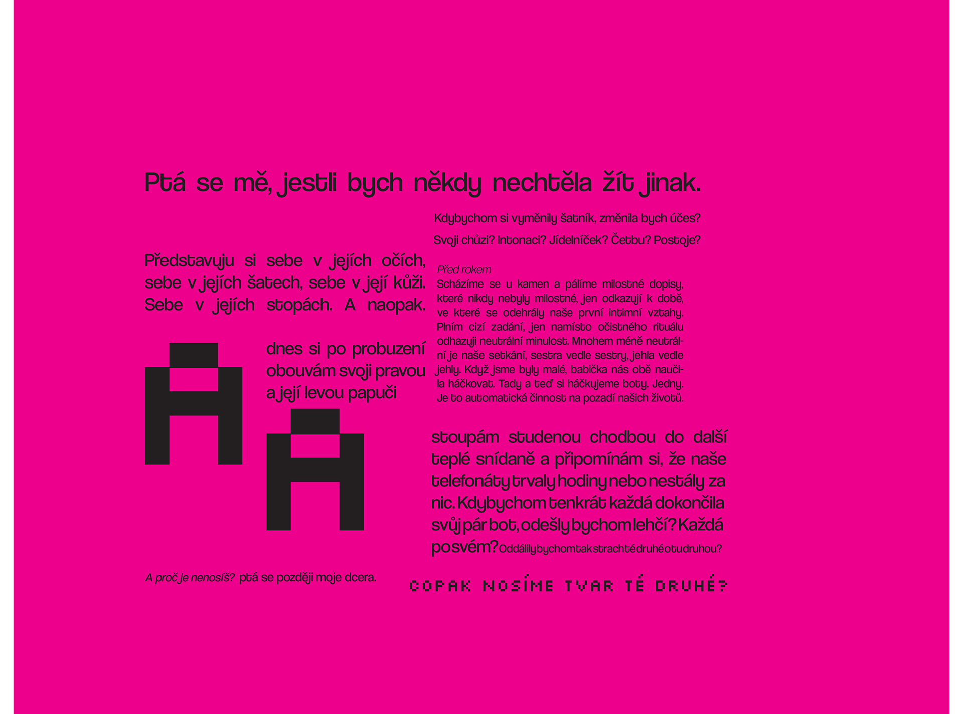 We meet by the stove and burn love letters that were never really love letters, only referring to a time when the first intimate relationships happened. I fulfill this extra task, yet instead of a cleansing ritual, I discard a neutral past. Far less neutral is our meeting, sister next to sister, needle next to needle. When we were little, our grandmother taught us both how to crochet. Here and now, we are crocheting shoes. Just one pair. It’s an automatic activity running in the background of our lives.
